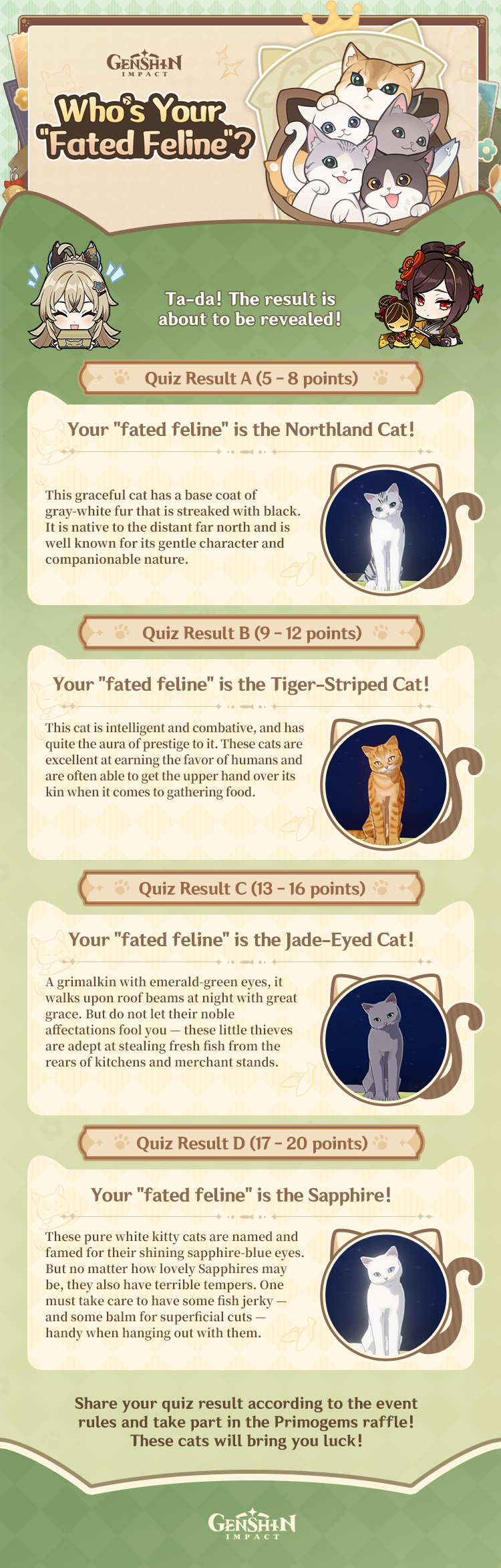 Take the following quiz and find out which cat is your "fated feline"! Share the test result and your Genshin Impact UID in the comments for a chance to win Primogems ×160!